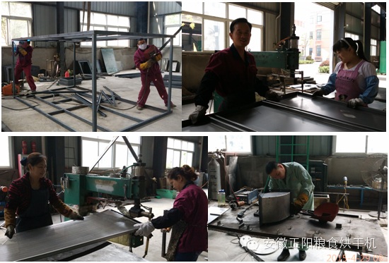 工人們正在車間內(nèi)加緊生產(chǎn)糧食烘干機(jī),現(xiàn)場機(jī)器轟鳴,焊花飛濺。