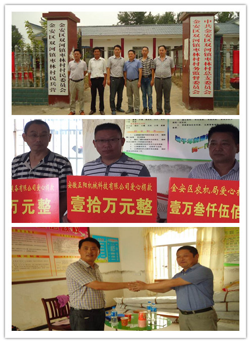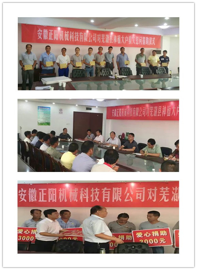 同時(shí)我公司針對今年長江中下游、江淮區(qū)域發(fā)生的嚴(yán)重的洪澇災(zāi)害勇于擔(dān)當(dāng),注重快速發(fā)展自身的同時(shí)更高度重視企業(yè)社會(huì)責(zé)任,本著以回報(bào)社會(huì)為己任;企業(yè)利潤來之于民、用之于民;義利兼顧的宗旨,安徽正陽機(jī)械科技有限公司總經(jīng)理張為法于2016年7月13日下午前往“正陽”糧食烘干機(jī)主銷區(qū)域安徽蕪湖、六安、湖北孝感等受災(zāi)嚴(yán)重地區(qū)捐贈(zèng)現(xiàn)金數(shù)十萬元,幫助災(zāi)區(qū)人民萬眾一心共抗洪災(zāi),盡快恢復(fù)生產(chǎn),讓受災(zāi)群眾真實(shí)感受到黨和政府的溫暖、民營企業(yè)家的責(zé)任,公司以正能量品牌的形象和風(fēng)范履行了自身應(yīng)盡的社會(huì)責(zé)任。