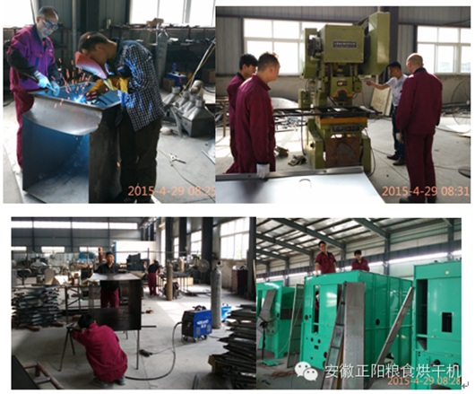 工人們正在車間內(nèi)加緊生產(chǎn)糧食烘干機(jī),現(xiàn)場機(jī)器轟鳴,焊花飛濺。