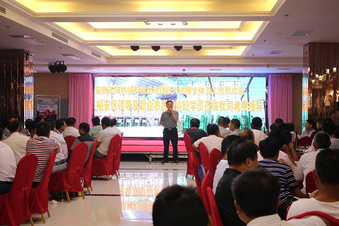 9月13日下午,裕安區(qū)職業(yè)農民培訓班一行人蒞臨我公司考察指導,此次培訓班由200多名種植大戶組成,場面十分熱鬧,公司張為法總經理、許為青副總經理、總經理助理胡家冀、銷售部部長張杰等參與了此次接待活動,張為法總經理代表安徽正陽機械科技有限公司表達了對于他們此次來訪的熱烈歡迎。